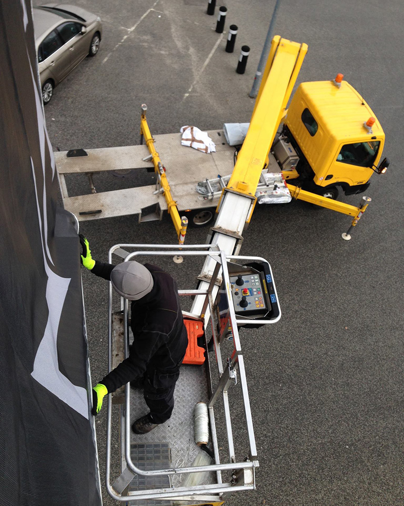 Vi har et superdygtigt montageteam hos Vincent Graphic. Vores montageteam har værktøjet og teknikkerne i orden. De er dygtige og monterer dit tryk, print eller skilt professionelt. Uanset om der skal monteres et skilt højt oppe på gavlen af en sportshal, som kun kan nås med en 24 meter lift, eller om det drejer sig om dekorering af en butiksrude med folie – klarer vi opgaven!